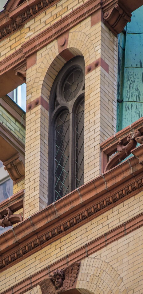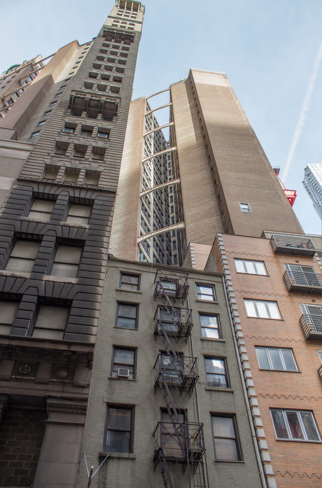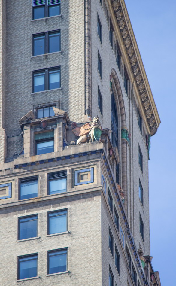 The developers picked a heck of a place to be conspicuous: The site was in “Newspaper Row,” the center of the newspaper industry from the 1840s to the 1920s and rich in professional critics. And the critics found faults. They complained that the Park Row Building had completely plain side and rear facades – no applied styling at all. The light courts facing Ann Street and Theatre Alley were braced with exposed steel beams. The shape of the building itself – dictated by the odd conglomeration of seven adjoining lots – made the tower ungainly.