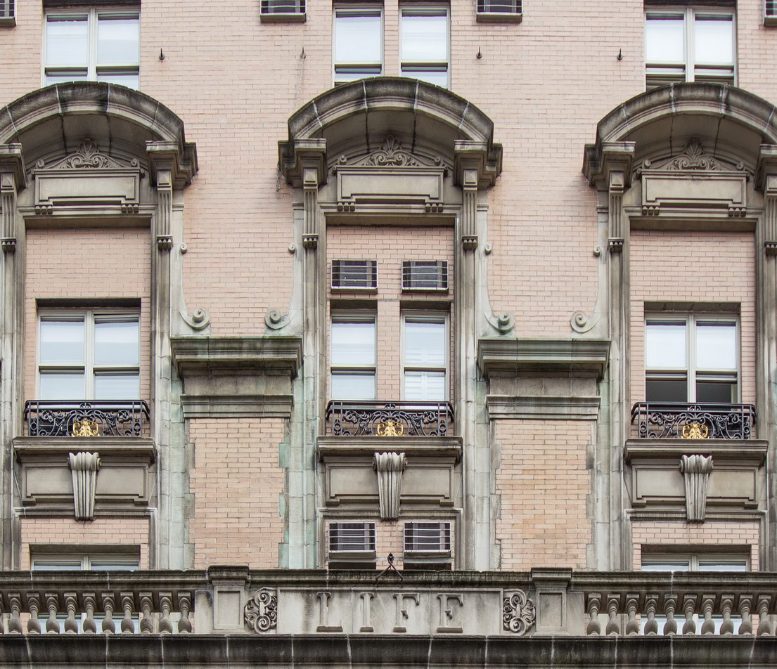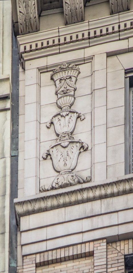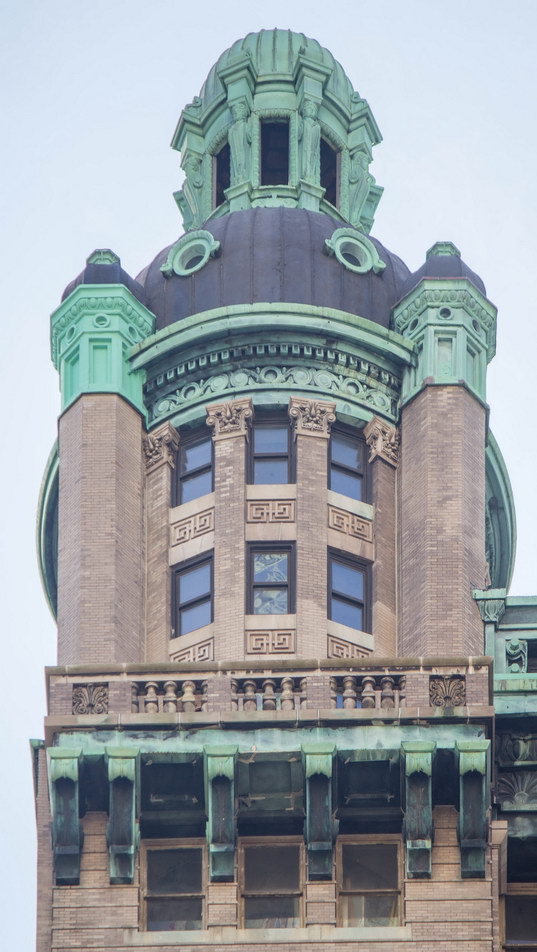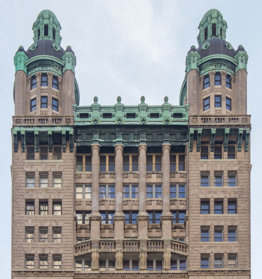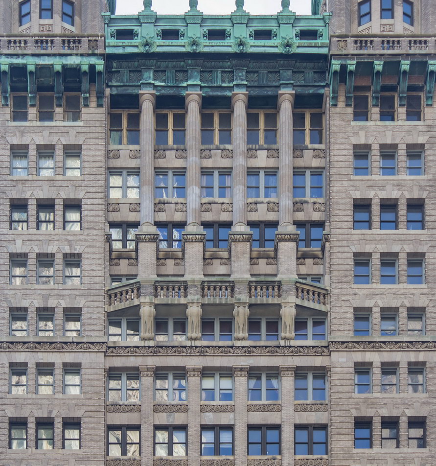 On one hand, the Park Row facade has three distinct vertical sections, which emphasize the building’s height, and a substantial limestone base and ornate crown. On the other hand, it also has six horizontal divisions, which diminish the building’s height. Robertson himself wrote that he had tried to make the building “look less than its real height,” according to The New York Times.